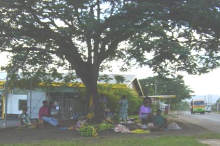 Women selling goods under a tree so they won't have to pay for a spot at the market.