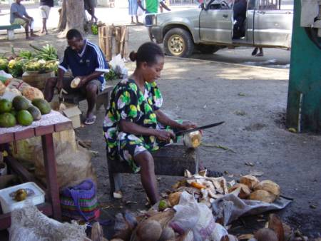 This woman is chopping the husk off of coconuts with her bush knife, which is basically a machete. Everyone walks around with these knives - as Aunt Linda said, it's like their wallet, they don't go anywhere without it!