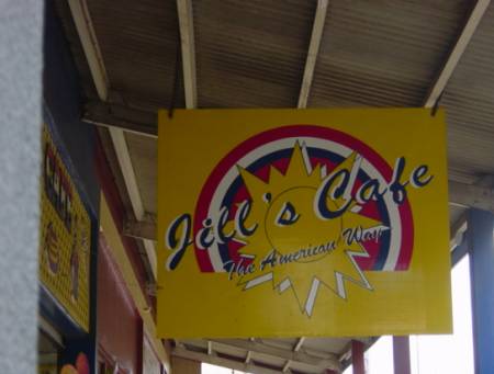 "Jill's Cafe The American Way" The menu had hamburgers, hot dogs, burritos, grilled cheese, everything that they thought was American.