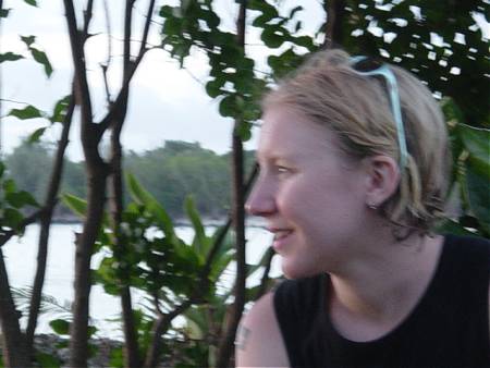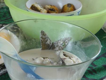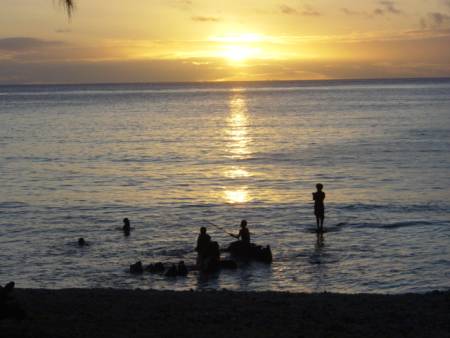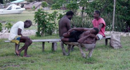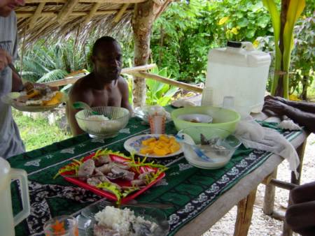 When Brendan and Phillip returned, Jimmy brought our lunch: White rice, pan fried fish middles, taro root, papaya (paw paw), fish tail soup with coconut milk, and lemon juice (lemonade)