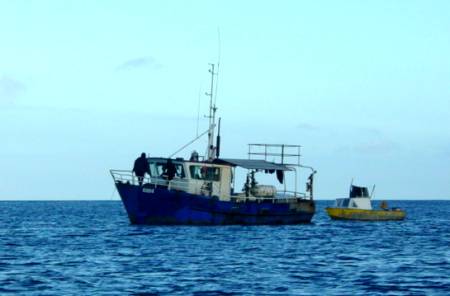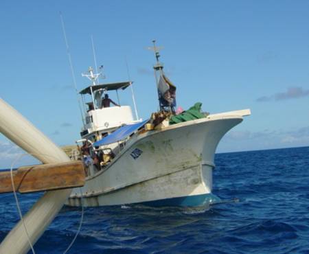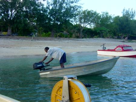 The Oiseau Bleu comes in closer to shore to meet our small boat.