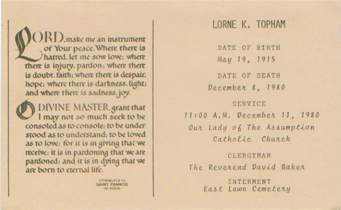 Other-Lorne K. Topham's In Loving Memory Card; Interment Card; Social Security Death Index; Lucille P. Topham's (Wife) Obituary; and Mary Reynolds Topham's (Mother) Obituary.