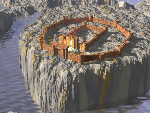 Greycastle is available on CD-ROM NOW! A custom ground height map(used in the images on this page) is included in .bmp format. The model is also available as a Bryce4 file with textures applied. Of course, this model is easily retextured to your liking. Caution: this is a large file and depending on your available RAM, may be a little slow in certain programs.