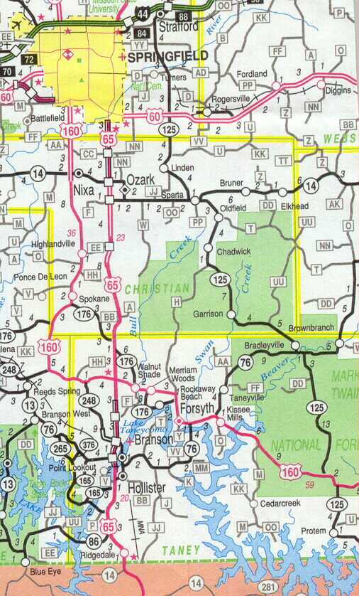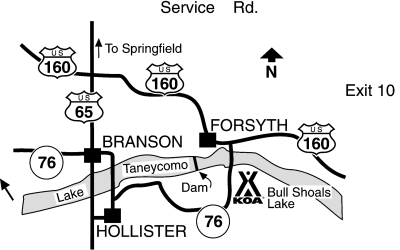 If you are coming from the north turn south on 65 at Springfield, Missouri then turn left on 160 go through the town of Forsyth then take a right on 76. We are at the top of the hill on the left.... If you are driving a large rv this route will be easier stay on 65 till you get to a four way light by Hollister turn left on 76 and follow 11 miles we will be on your right....