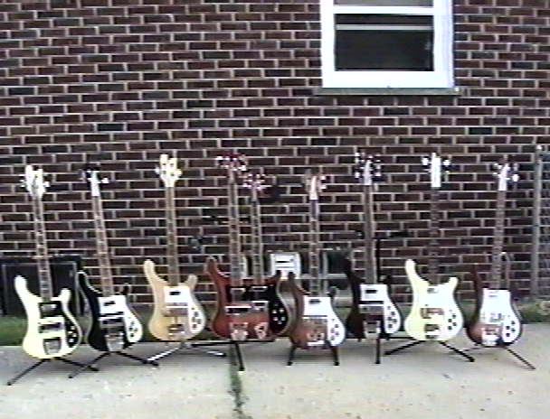 1.) My Rickenbacker collection left to right, My first real bass a-1976 White 4001 setup Geddy Lee style with a BadAss bridge and pickup cover removed, 1983 JG (black) 4001, 1979 Mapleglo 4001, 1979 Fireglo 4080 doubleneck, 1979 Walnut 4001, 1983 Burgandyglo 4008 8 string, 1991 Chris Squire signature, and a 1999 Fireglo V63 1963 re-issue.