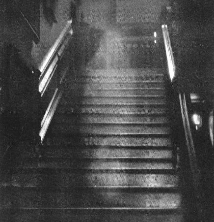 This photograph was taken by Rev. R.W Handy at the Queens home in Greenwich.The photograph has been tested by Kodak who can find no explanation for the ghostly image on the stairs..