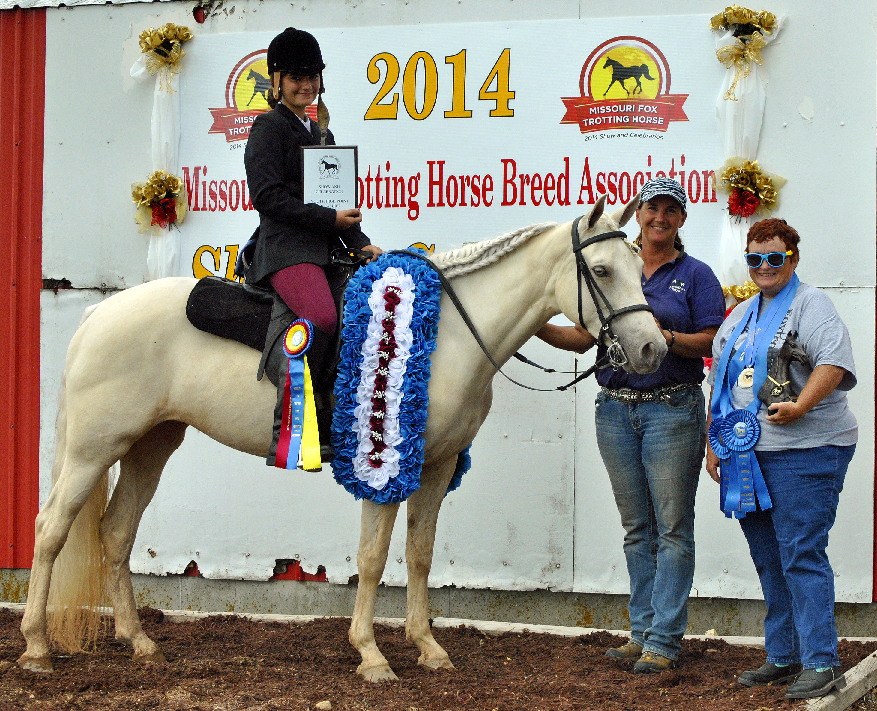 Pictured are Nichole Copple riding Velvet and Jennifer Vaught riding Nova. Both horses won two World Grand Championships at the Missouri Fox Trotter World Celebration. Nichole and Velvet won the Youth Versatility and the Amateur Ranch Horse Versatility. Jenny and Nova won the Open Versatility and Open Ranch Horse. Both horses are wearing beautiful double garlands. Tony Vaught is holding young Aaron and Justin Vaught is standing by Velvet.