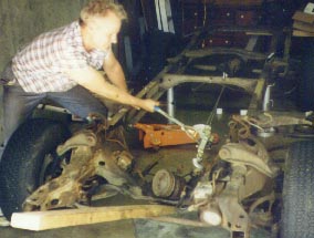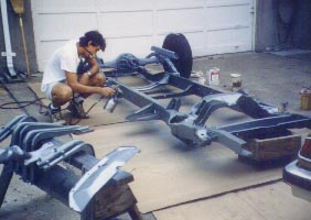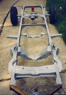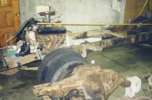 This is the stripped frame with the original motor, 3 speed tranny, and 4:11 geared rearend. Sitting next to it is the Camero sub-frame that we would soon add.