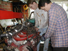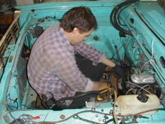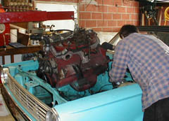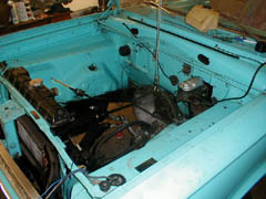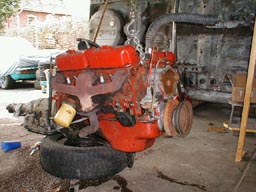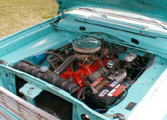 In Apr. 2000, we yanked the slant 6/904, did some minor painting, cleaning, new tranny lines, V8 radiator, and fixed the MC brake lines, fabricated a dual exhaust tranny X-member and dropped the motor in.