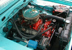 Here is the 318 assembled and painted Chrysler Red. I think it could pass for a stock 273 4 bbl don't you? I coated some 273 exhaust manifolds with Eastwoods hi temp coating and they really seem to be holding up well! In Nov. 2000, I installed a set of try-y Spitfire Headers. They fit well and are very well made for the price. I'll probably go with them on my 66 as well.