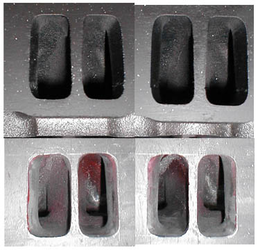 These are the "302" heads before and after. The stock ports are on top, the ported on bottom. Unfortunately, the pictures didn't show all of the benefits of the porting. When I tore down the heads, I could barely get my index finger in the intake ports sideways. When I finished, I probably had an average of .25" more clearance.