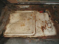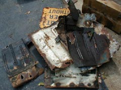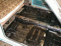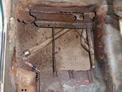 The previous owner had decided that a quick fix was in order so he arc welded "patch panels" in place. The panels, as best I can figure, were taken from an appliance of some sort, and a construction safety sign. The fit of these panels were less than desireable. The rear seat side panels never fit right and the numerous carpet pads used to keep the road noise down only held moisture.