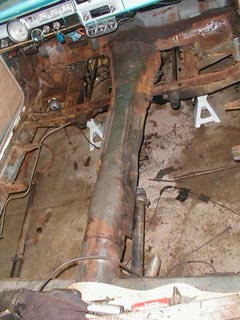 Doesn't look all that bad from the top but from underneath it was bad. Years of a leaky tranny had made the undercarriage a gooey, oily mess. The emergency brake cable supports weren't even attatched to anything.