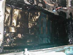 This is the pass. side. On the left is the top of the frame connector where it pokes through the pan. On the right is the whole pan before I POR 15d it.