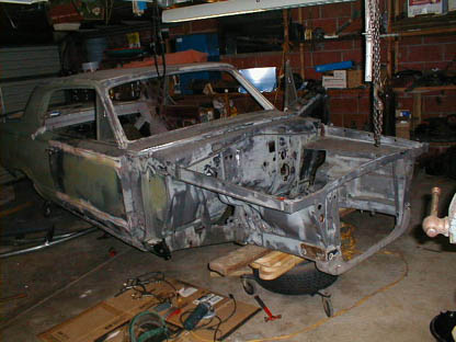 Sandblasting the body/parts. I made up a towbar to take the shell out to a friends farm and blasted it the 2nd weekend in Nov.'99. Couldn't believe that it was 80 degrees that weekend! I didn't feel as strong after it was all over.