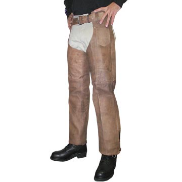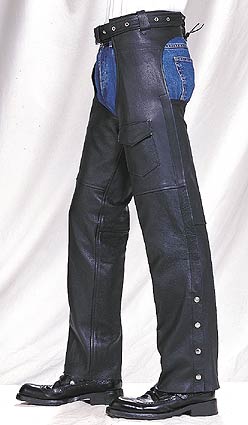 Men's braided chaps in a durable, medium weight, top grain leather. This pair of black chaps includes a braided detail running up the sides. It also features a front pocket as well as silver snapping cuffs and a belt buckle.
