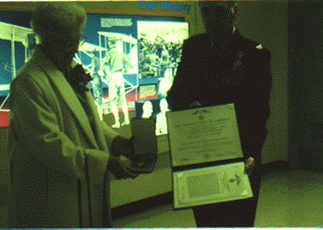 This picture is of William Pitsenbarger's mother and the Medal of Honor they recieved for their son's bravery on April 11, 1966 which was presented to them on December 8, 2000.