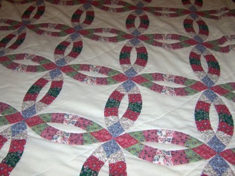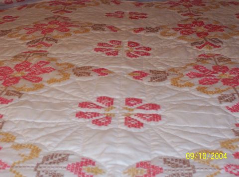 "This was an old pattern from the newspaper & I ordered it years ago. Each block is different & hand quilted different & different colors. I was trying to use up some of the material I had laying around. There were 4 basic designs & you could change them to suit yourself. I was going to make a queen size to begin with, then went on to make it more king, then queen. My grandaughter help me match material."