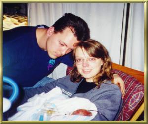 This picture was taken just about an hour after Casey was born. They wheeled Mommy in on her bed, so I could meet my son
