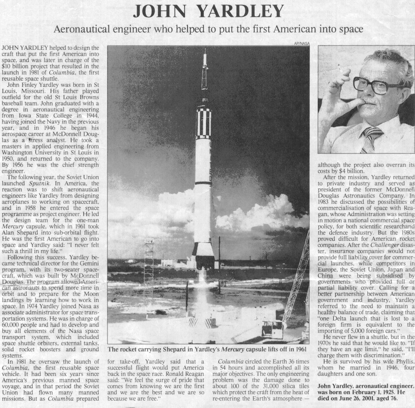 "JOHN YARDLEY helped to design the craft that put the first American into space, and was later in charge of the launch in 1981 of Columbia,