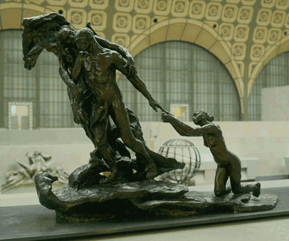 Camille Claudel’s L’âge mûr (1895-1903) is a bronze sculpture which can be seen at the Musée d’Orsay in Paris. According to the description given at the Musée d’Orsay website (lire la description en français) (my paraphrasing/translation) this work was done as Camille and Rodin’s relationship was coming to an end. It depicts the love triangle Camille felt that she was experiencing as Rodin clung still to his long-time relationship with the mother of his children, Rose Beuret. Camille depicts herself as the lithe, gentle young woman, on her knees with outstretched arms, imploring Rodin to stay, as he, in the middle of the two women, is being pulled away by the decrepit older woman. However, the sculpture can also be seen as an allegory of time leading youth to old age and death. Rodin (according to the film Camille Claudel [1989] ) believed Camille to be showing the more personal symbolism of their relationship, and was horrified to see that she would open their lives to public scrutiny in such a way, especially as he was in the midst of the controversy surrounding his Balzac sculpture. |
