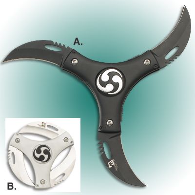 Featuring an awesome array of three 440 stainless steel blades styled in a cyclonic whirlwind. Each blade measures approximately 2 1/2" long and precisely closes into the aluminum handle.