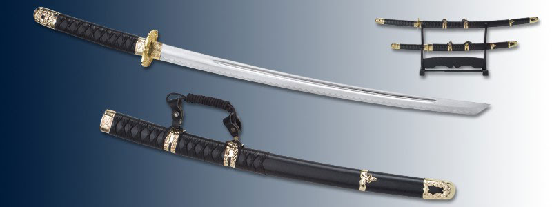 Designed from the original 1937 officer's katana, this modern version is nothing short of spectacular. Each blade is constructed from 420 stainless steel with a heat tempered finish. The black wrapped handles are accented with high coated brass tsuba and pommel. The coordinating blade scabbards are also wrapped and feature brass accents and nylon cording. Includes a hardwood table top display stand. katana : 38" overall, 26 1/2" blade wakisashi: 29 1/2"overall, with a 19 1/2" blade.