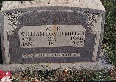 WD William David Miller April 29, 1866 January 16, 1945 GONE BUT NOT FORGOTTEN son of Joseph Jackson & Francis Shawler Miller husband of Nora Mae Campbell (Submitted by Becky Pyland Davis)
