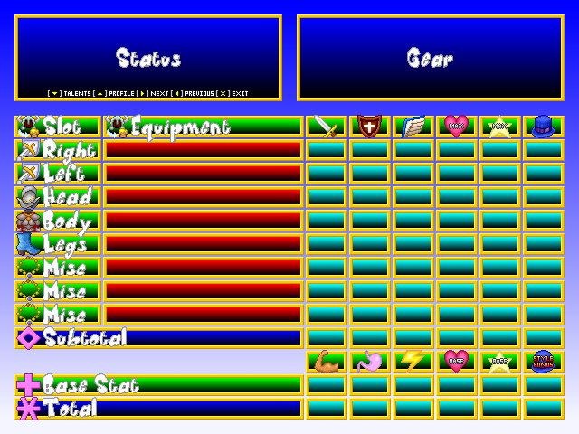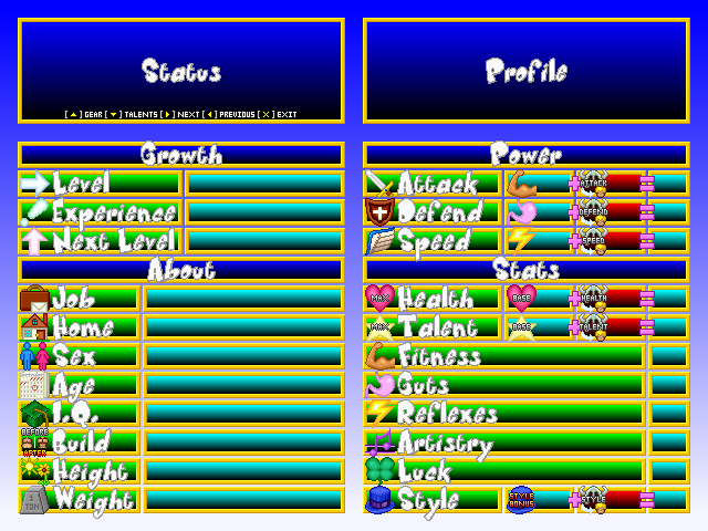 ^ Character info goes on the left. The big blank box is where the character portraits go. The smaller blank box is for the name logos (see below). The skinny little bar is a level-up meter.