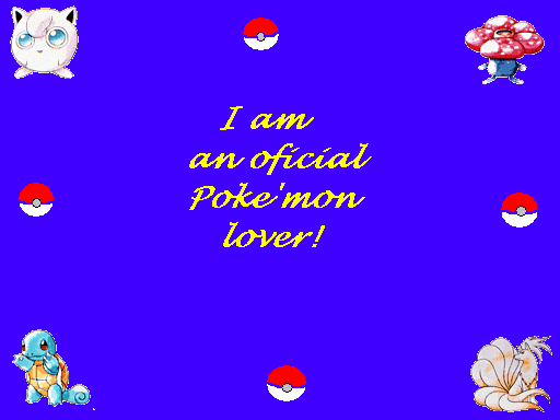 Ok, so your probably tired of seeing pikachu, but he is one of my favorite pokemon. I really like the backround in this picture, even though I thought it was a little plain at first. I have not edited it yet, but once I complete my website, I plan on adding a little bit to his apperance. (heh heh) Let me know if you have any suggestions on my drawings, or other peoples, or websites pictures. I don't have any of my art in here yet, but once I get my scanner, I will put some on certain pages. |