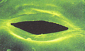 Stomata (stoma):Opening (controled by guard cells) on the surface of a leaf that allow for the exchange of gases between air spaces in the leaf interior and the atmosphere. Also allows water vapour to escape by transpiration.