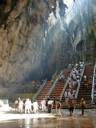 Located 13 km.north of Kuala Lumpur. These magnificent caves have been known to local inhabitants for centuries. However, they became famous as a sightseeing and pilgrimage site only after they were stumbled upon by westerners in the late nineteenth century. Of the three caves that comprise the site, the largest and best known is the Temple or Cathedral Cave, so named because it houses a Hindu shrine beneath its 100 m vaulted ceiling. In late January of each year, during the Hindu festival of Thaipusam , thousands of devotees and other visitors climb the long entry stair and throng this magnificent cavern. As a form of penance or sacrifice, many of the pilgrims carry kavadis, large, brightly-decorated frameworks attached to a melange of body-piercing implements.