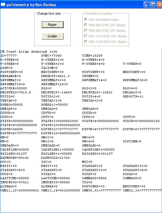 ![]() The program of John Pultorak which was supposed to monitor the AGC was simply displaying the registers of the AGC and allowing to change them, but this program was not written with the native language of the AGC, but with a modern language, the C language (and it is not just a supposition, for I have downloaded the project of Pultorak, and compiled his application with a C compilator, the visual C++ 6.0 of Microsoft). |