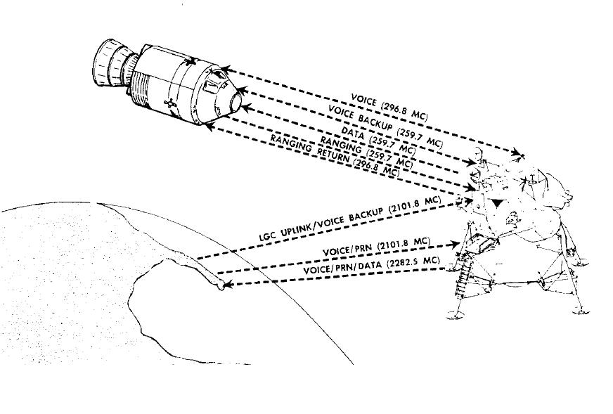 ![]() La seconde absurdité est que le module lunaire ne devrait pas envoyer le vecteur d'état mis à jour au module de commande sur la liaison de communication de la voix (que j'ai colorée en rouge sur ce schéma de GRUMMAN), mais sur la liaison de communication des données (que j'ai colorée en vert sur le schéma), qui est adaptée pour ce faire, contrairement à la liaison de communication de la voix. |