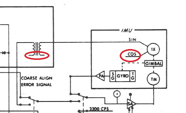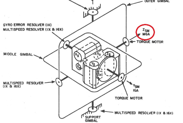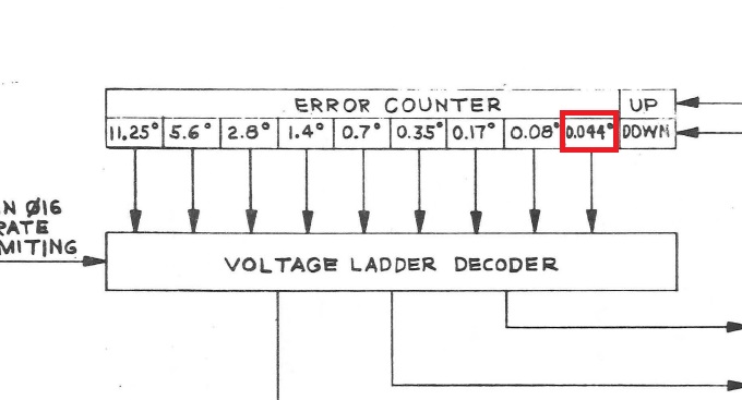 ![]() Mais le bit de poids le plus faible de ce convertisseur correspond à une variation d'angle de 0,044°. Cela signifie que le programme de guidage peut changer les angles de l'IMU, et cela inclut l'angle MGA, avec une précision qui n'est pas meilleure que 0,044°. |