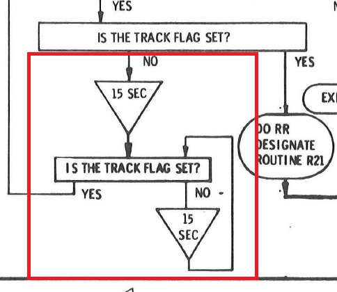 ![]() Et ensuite le programme donne le choix à l'astronaute de terminer le programme ou non. S'il choisit de ne pas terminer le programme, la boucle complète est exécutée à nouveau avec les drapeaux P25 et TRACK toujours positionnés. Cela signifie que le programme n'a pas de porte de sortie automatique; l'astronaute peut le bloquer indéfiniment s'il le veut...ou s'il omet de répondre à la question. N'est-ce pas un peu dangereux? |