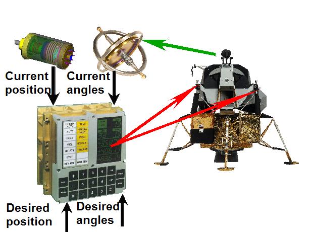 ![]() Quand le programme du RCS veut donner au module lunaire une attitude définie, il commande les réacteurs latéraux jusqu'à ce que les angles mesurés (mis à jour à partir des données de l'IMU) concordent avec les angles désirés. |