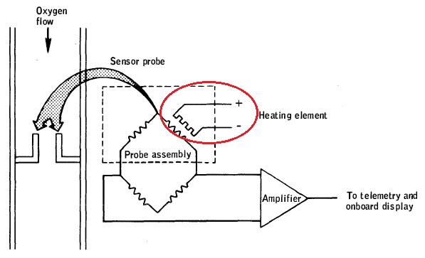 ![]() The oxygen flow measurement would have shown a wrong indication because a heater winding resistance (circled with red) within the flow sensor bridge would have increased from 1000 ohm to 1600 ohm. How is it that this resistance changed? How could they not see in the preflight tests, since they could see it in the postflight tests? |
