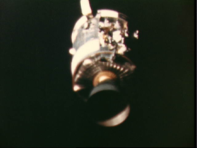 ![]() Photographic data were obtained of the service module entering the earth's atmosphere and disintegrating near the command module. The crew observed the service module about 5 minutes after separation and indicated the reaction control thrusters were firing and the module was rotating about the X plane. They give this delirious explanation: It would have been possible for the remaining propellants to move axially at frequencies approximately equal to the precessional rate of the service module spin axis about the X body axis causing a resonating movement. This is a totally fantasy explanation, and there is no way that the thrusters could have been firing, as it is obvious they are deactivated before the separation. |