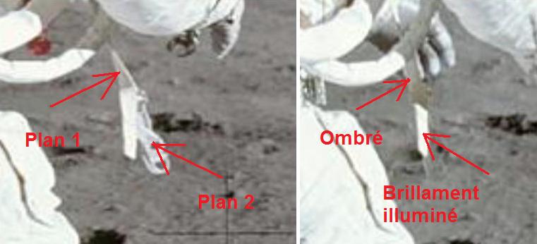 ![]() Sur la photo AP11fr10, l'astronaute touche le drapeau avec sa main, mais ce n'est pas le cas sur l'ombre. |