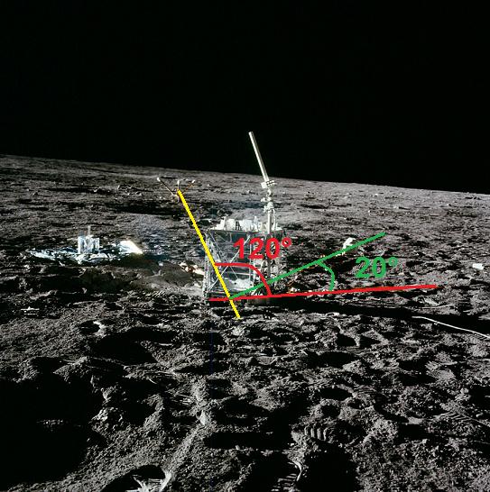 ![]() On this photo (AS12-47-6927), the ALSEP's antenna does not make an angle of a little more than a quarter of a turn relatively to the shadows; it is in opposition to the direction of shadows (i.e. it looks toward the sun, like the high-gain antenna). |