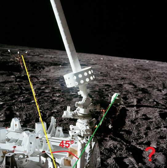 ![]() On photos AS12-46-6817, AS12-46-6816 and AS12-46-6815, we have three views of the ALSEP with three ribbons stretching behind. On photo AS12-46-6817 we have a view taken obliquely from far. The angle between the two extreme ribbons is approximately 120°, and, because the photo is taken obliquely, the angle between the middle ribbon and the leftmost one is greater than the angle between the middle ribbon and the rightmost one. ![]() On photo AS12-46-6816, the photographer has gone closer to the ALSEP and is now facing it; the angle between the ribbons has been reduced in reason of the fact that the astronaut has come closer; the angle between the two extreme ribbons is now approximately 105°; the angle between the middle ribbon and the two other ribbons is almost the same in reason of the fact that the photographer is facing the ALSEP instead of taking it obliquely. ![]() On photo AS12-46-6815, the photographer has gone still closer to the ALSEP, and obliquely again; the angle between the ribbons is still reduced since the photographer has gone closer to them. The angle between the middle ribbon and the rightmost ribbon is smaller again than the angle between the middle ribbon and the leftmost ribbon, and the latter is approximately 45°; it means that the angle that the middle ribbon makes with the rightmost ribbon is logically less than 45°: With a such angle we should see the rightmost ribbon on the photo and we don't see it! |