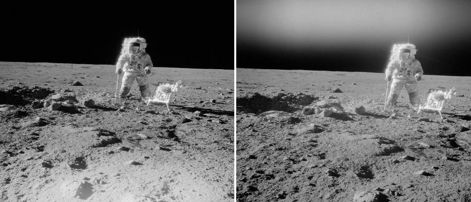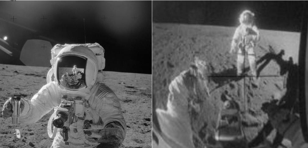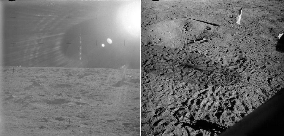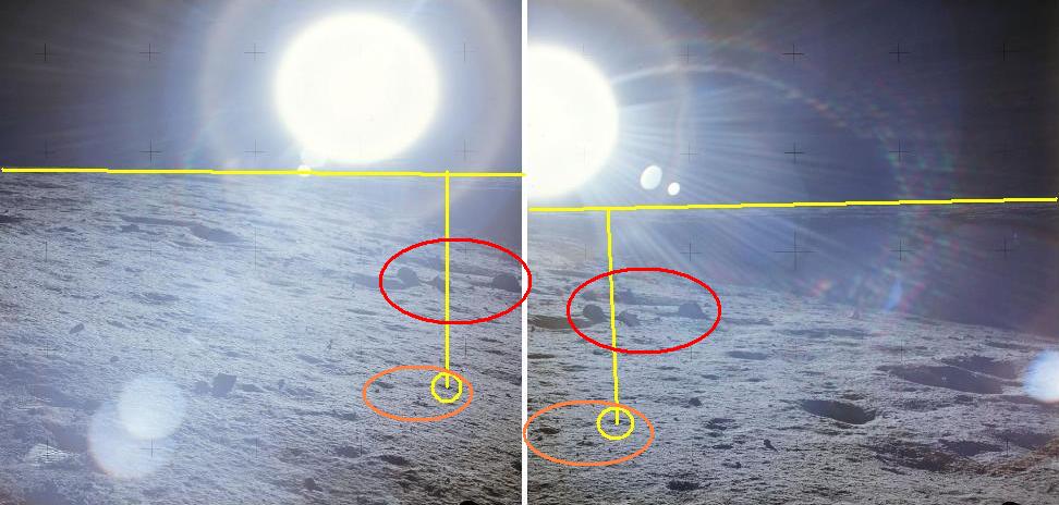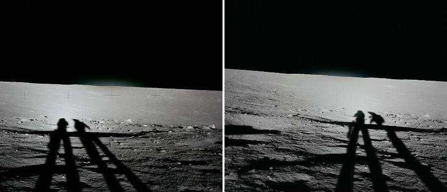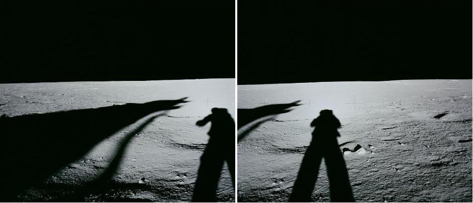 ![]() On this pair of photos in Apollo 12 (AS12-49-7271 and AS12-49-7273) we can see the photographer's shadow, and it has the correct orientation on the two photos. So what's the problem? ![]() On these close-ups of the photographer's shadow of the two photos, we can see that the photographer's shadow has a quite stronger profile on AS12-49-7271 than on AS12-49-7273; yet the photographer's shadow is approximately at the same distance from the left side of the photo on AS12-49-7271 as it is from the right side of the photo on AS12-49-7273, and so the profiles should be equivalent, and not so different! |