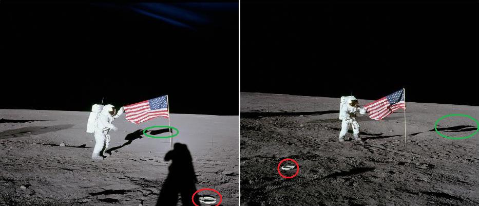 ![]() There is a deviation of the shadows of the astronauts because a depression of the terrain in the reflection of the visor...But there is a bit of shadow, I have circled, which is before the place that the shadows are deviated, and which thus has no rational explanation. |