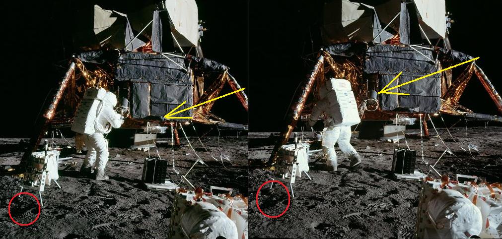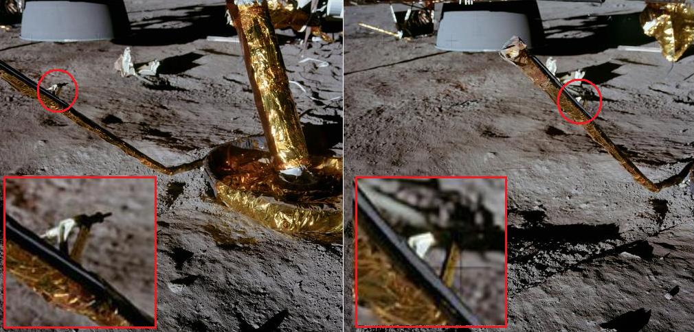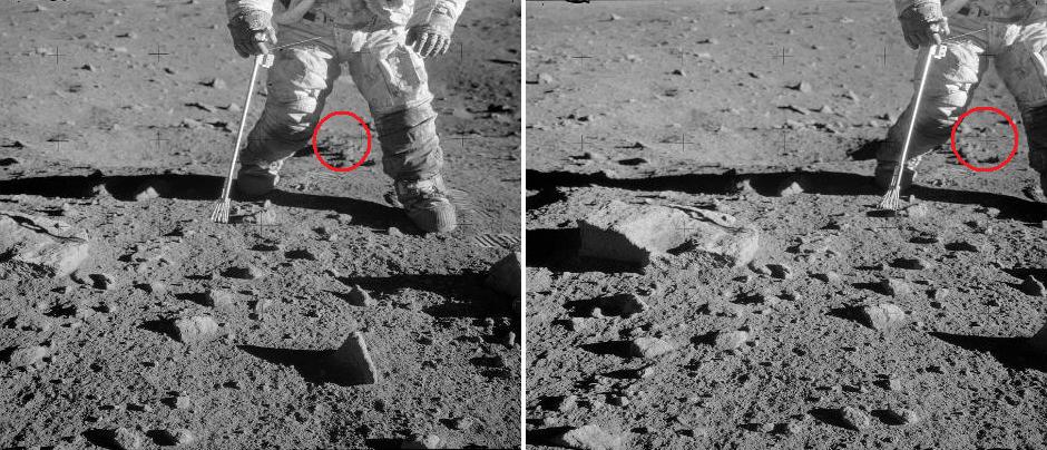 ![]() Between the legs of the astronaut there are little rocks which are present on photo AS12-48-7150 and absent on photo AS12-48-7149 in the zone that I have circled in red. |
