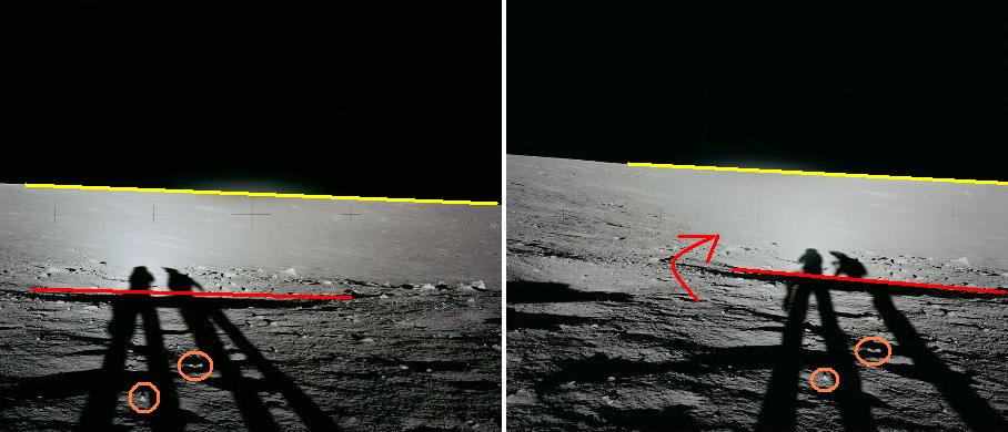 ![]() On photos AS12-46-6779 and AS12-46-6780 we see a path of footprints; between the two photos the photographer has made a little move, no more than a step, and yet the angle that the path makes with the horizon line varies importantly. |