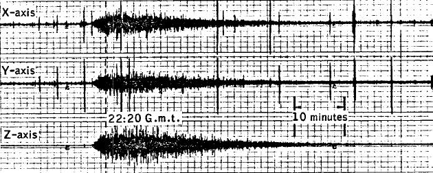 ![]() Hamish Lindsay says this about the impact of the ascent module of Apollo 12 on the moon: "When the Apollo 12 LM hit the lunar surface at 6,048 kilometers per hour, 72 kilometers from the landing site, digging an estimated 9 meter wide crater, the results were astonishing. All 3 seismometers in the package recorded the impact, which set up a sequence of reverberations lasting nearly an hour." And he shows this recorded plot of the event. |