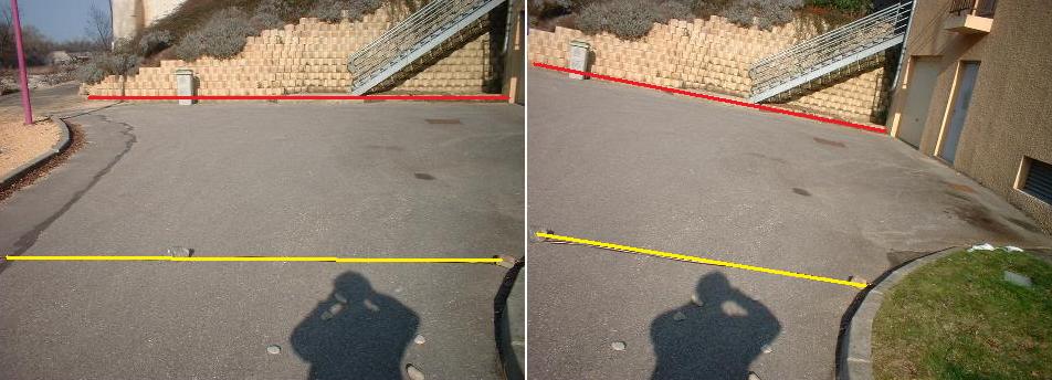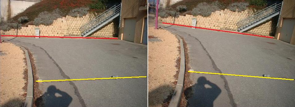 ![]() We can see that the position of the lateral thruster relatively to the holes is the same on the two photos; this means the photographer has made no lateral move. There is a little vertical move of the thruster which shows that the camera has been a little lowered between the two shots, but this move tends to make the thruster turn clockwise. ![]() In order to show it to you, I show you a little demonstration, in which I orient a broomstick like the indicated edge of the thruster, and I take two shots, one from up, and one after bending down ; when I bend down, we can see a slight rotation of the broomstick clockwise (with the same orientation of the cameral). As the orientation of the indicated edge of the thruster has not changed between the two photos (by counter rotating the camera), the horizon line should have slightly rotated counterclockwise between the two photos, but it’s not the case: It has made an important clockwise rotation instead! On example more of foreground and background rotating contradictorily. |