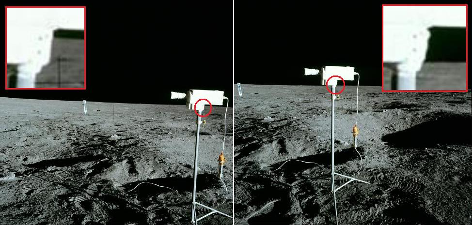 ![]() Photos AS12-46-6755 and AS12-46-6756 show two views of a camera mounted on a tripod. If we look attentively at the camera, we can see that its handle is not exactly the same on the two photos, there is a detail changing. I show a close-up of this handle in a window on each photo. |