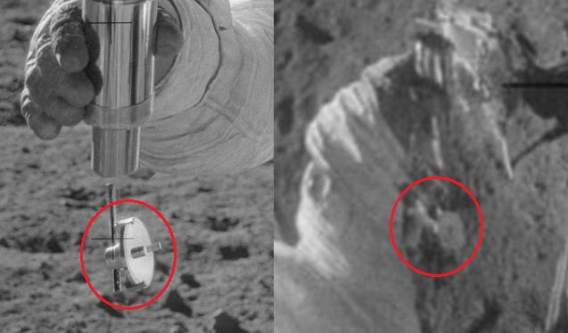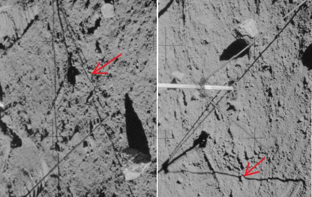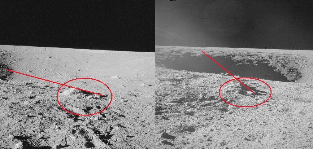 ![]() On this pair of photos in Apollo 12 (AS17-49-7182 and AS12-49-7186) we have two views of a hole with stones nearby. What's the problem with this pair of photos? ![]() I have symbolized the hole with a ribbon (I have loaded with stones to avoid it being taken away by the wind), and two stones which are near this hole. I am going to take the hole and the two stones under angles which are close to the ones we see on the Apollo photo. ![]() On the first photo I take a first view of the hole with the two stones. The direction of the two stones points at the beginning of the hole. And on the second view taken under a different angle, the direction of the stones is still pointing at the beginning of the hole. ![]() So why on the Apollo photo has the orientation of the direction of the stones so radically changed? On the first photo it points at the beginning of the hole and on the second one it points at the center of the hole! Isn't it a clear incoherence? |